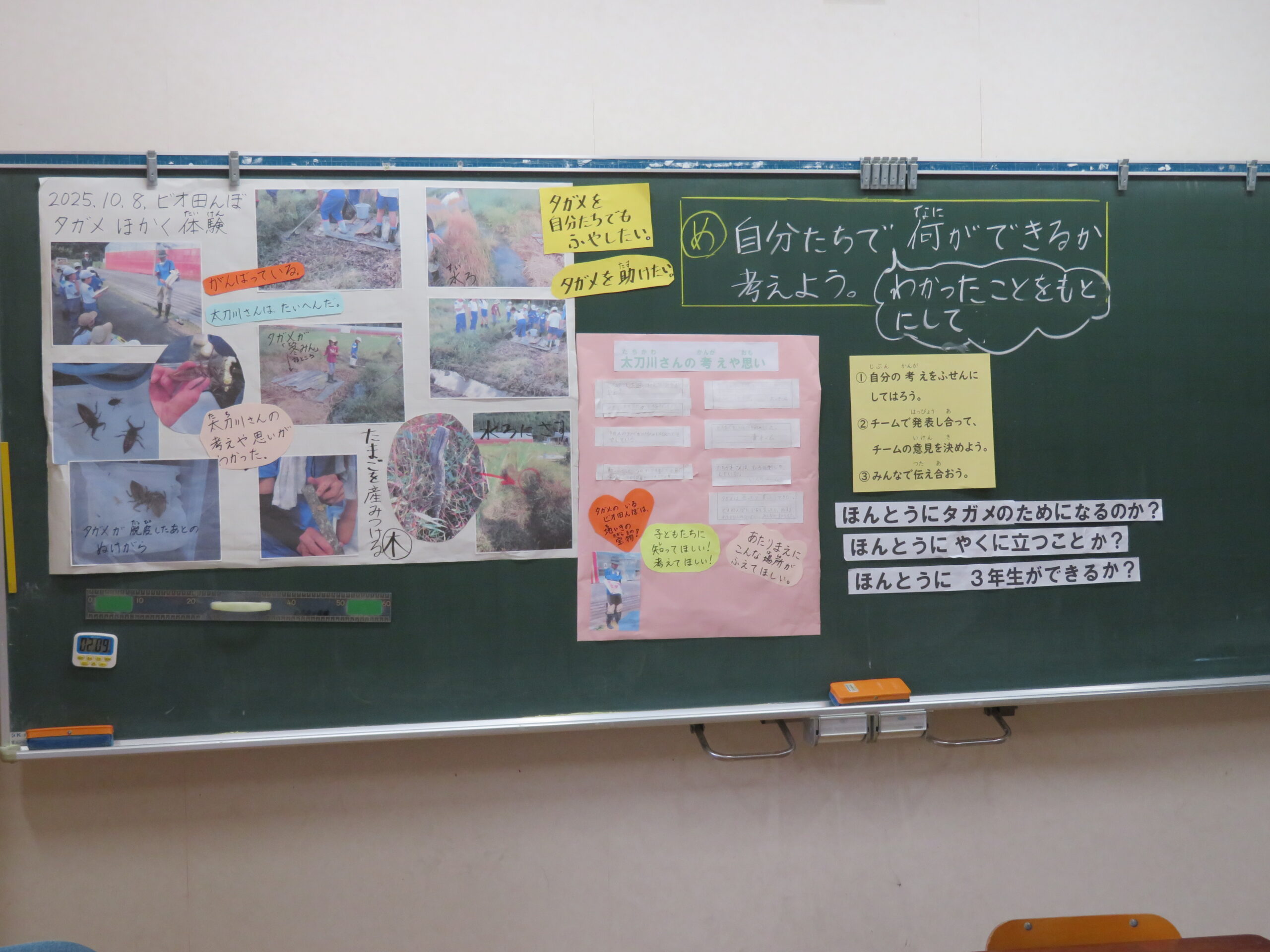 3年生の「タガメを何とか守っていきたい」という願いが伝わる授業でした。全員がその願いをもって授業に臨んでいるので、学ぶ意識の高さをそれぞれの子どもから感じることができました。タブレットを駆使して、タガメを守る作戦を他の人と交流しながら相談する場面もありました。多くの先生方から、3年生の学びの姿勢に対するお褒めのお言葉をいただきました。 |