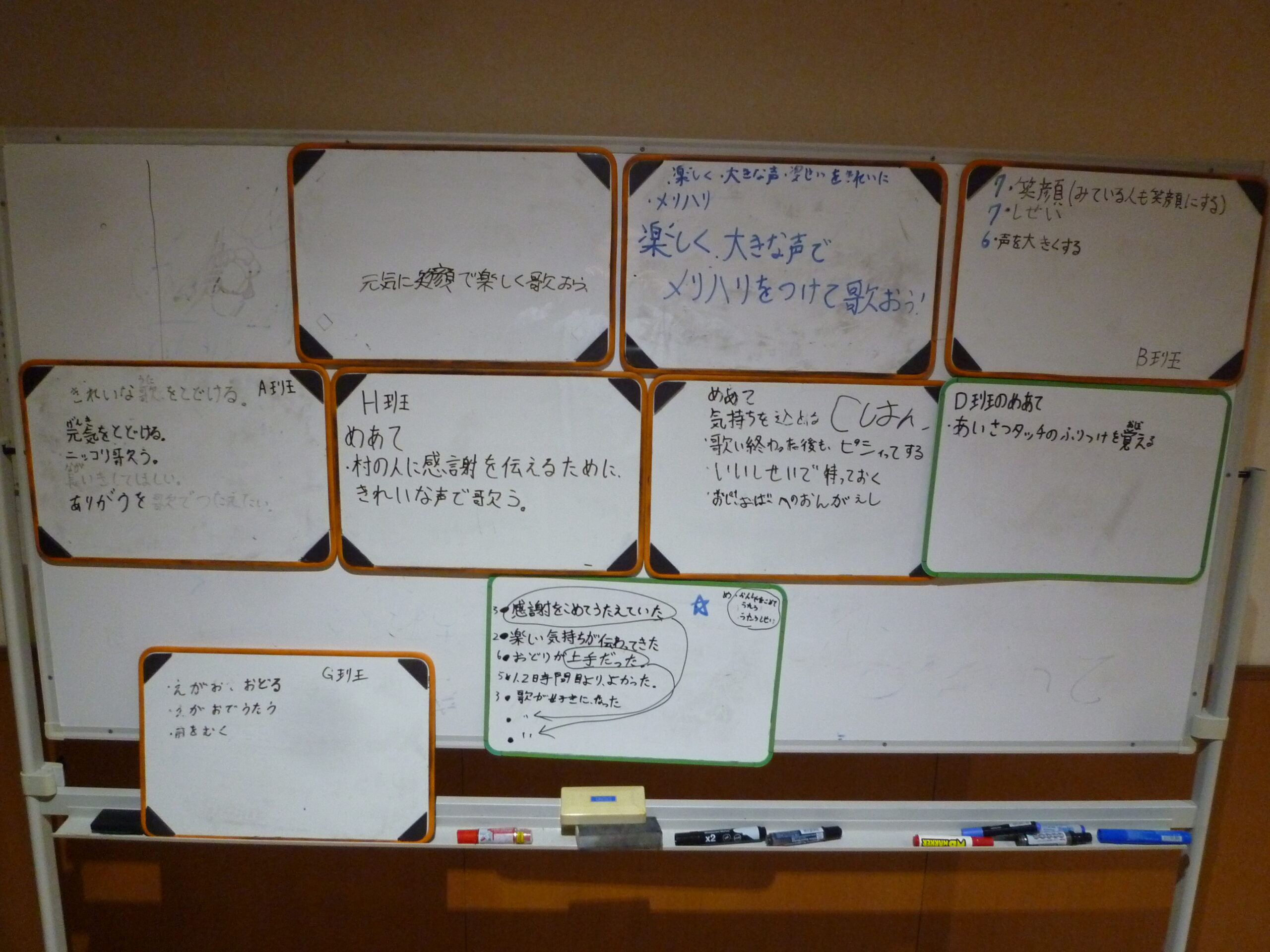 本校体育館にて、西粟倉村福祉大会が行われました。今年はホームタイムを使って、この会の目的はか、高齢者の方々に何を伝えたいのか、それを歌に表現するにはどうしたら伝わるのかを、縦割り班ごとに考えました。そして、各班ごとで目標を設定しました。目標はホワイトボードに記入し、体育館入口付近に掲示しておきました(左上)。さらには、入場前に、各班の班長が再度、目標確認をし、この会に向けての意気込みを6年生が全校に語り掛けてくれました。