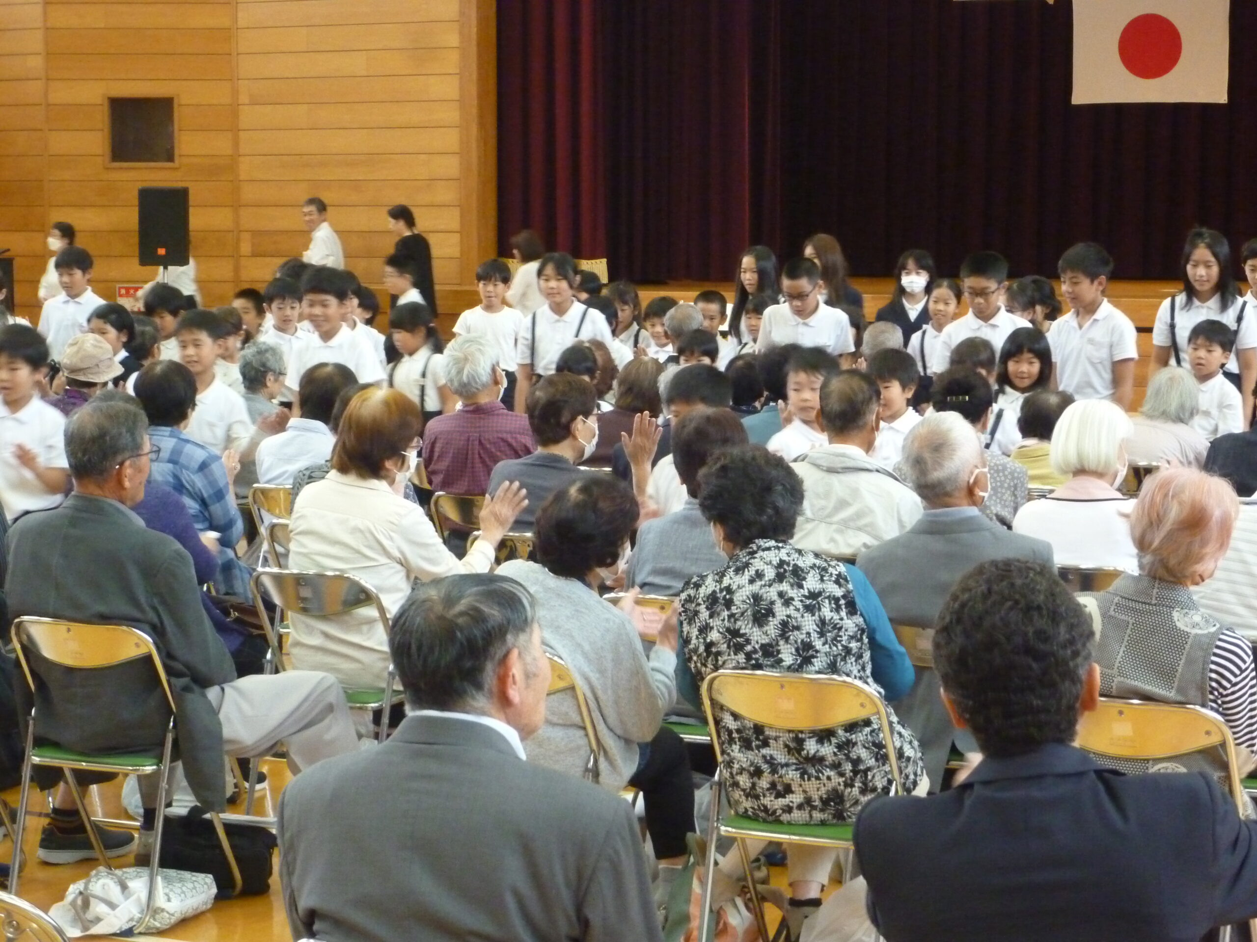 最後に、高齢者の方々とタッチをしながら退場する場面では、高齢者の方々と児童のにこやかな笑顔が見られました。この風景は、いつ見ても素敵です。心が温まりました。