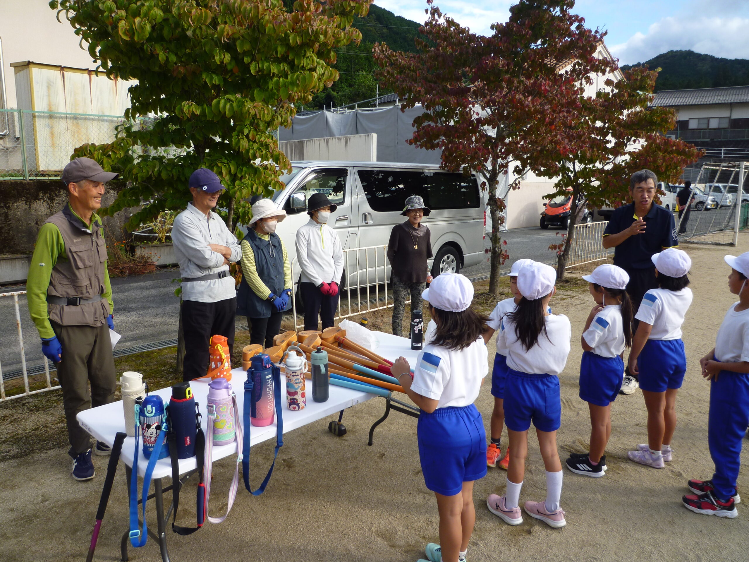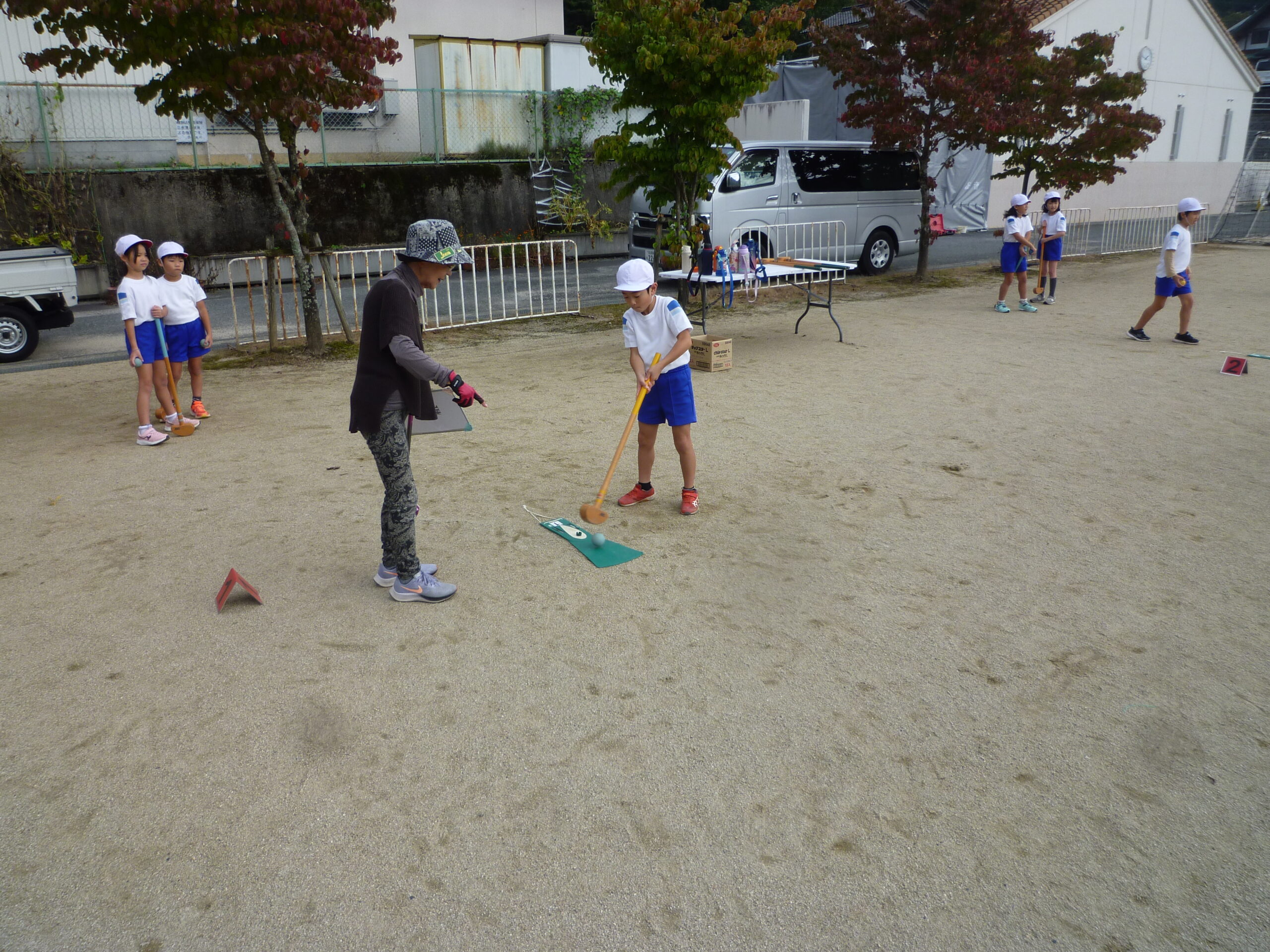 西粟倉グランドゴルフクラブの方々がお見えになり、2年生にグランドゴルフを教えてくださいました。
