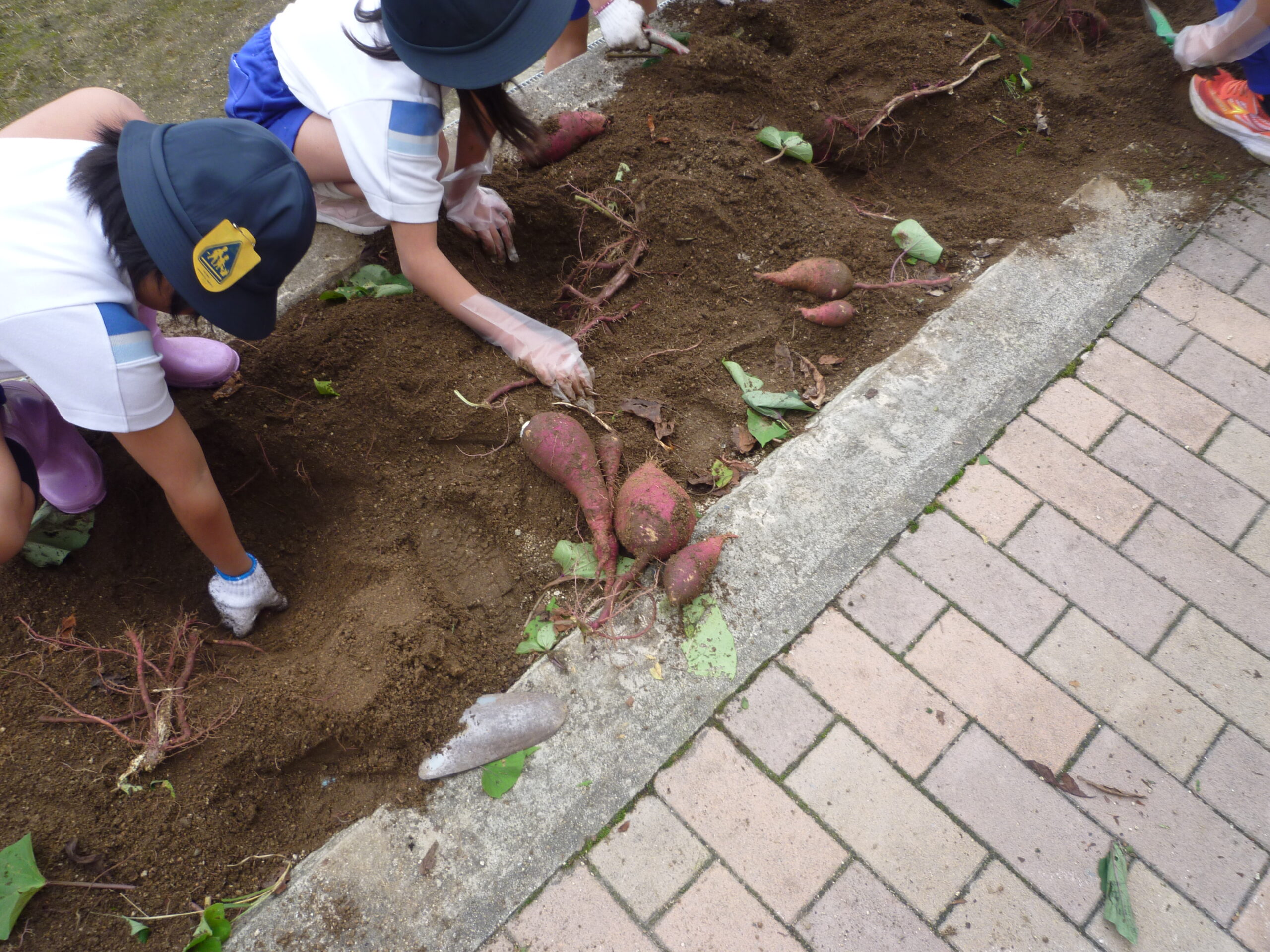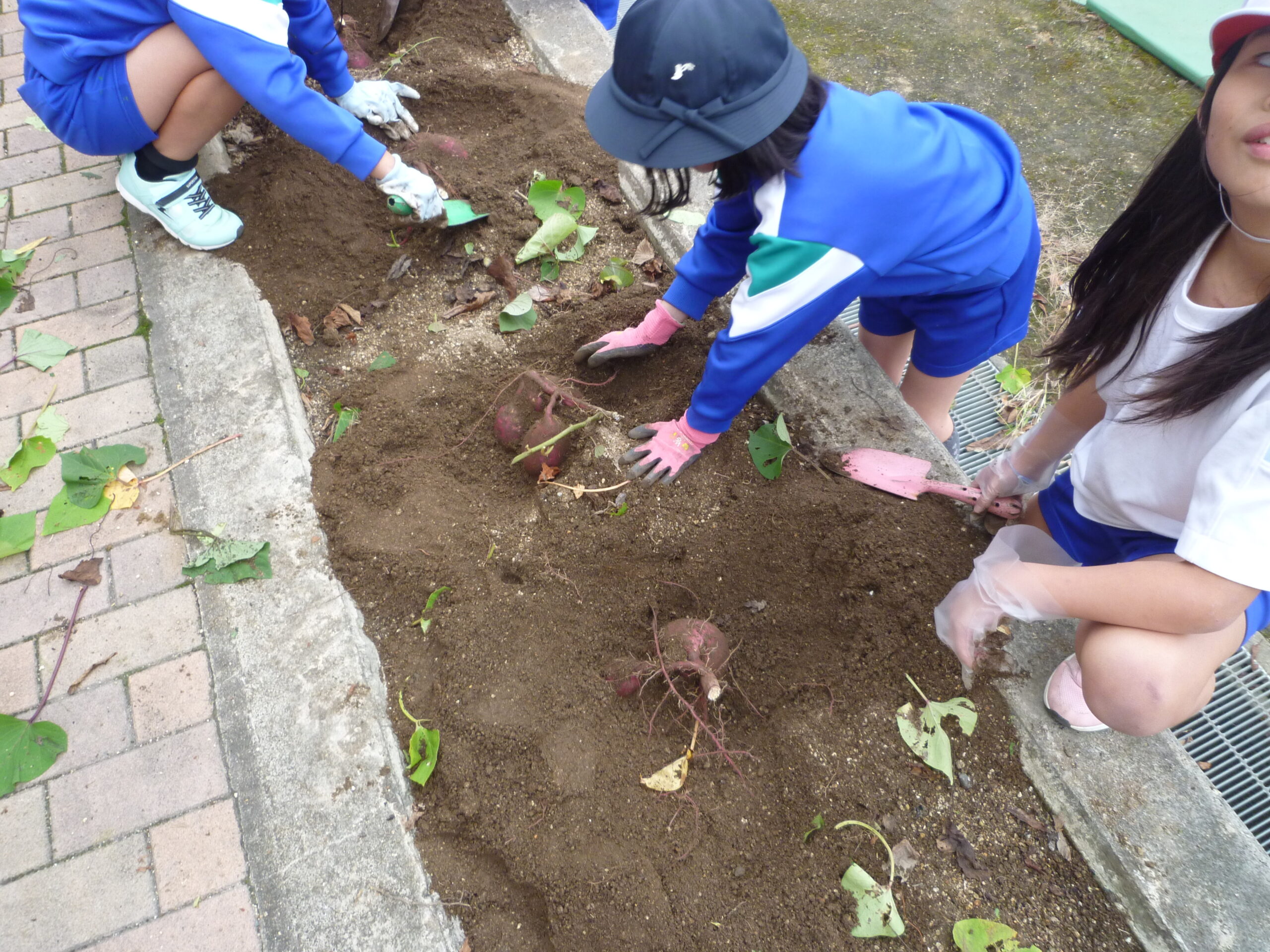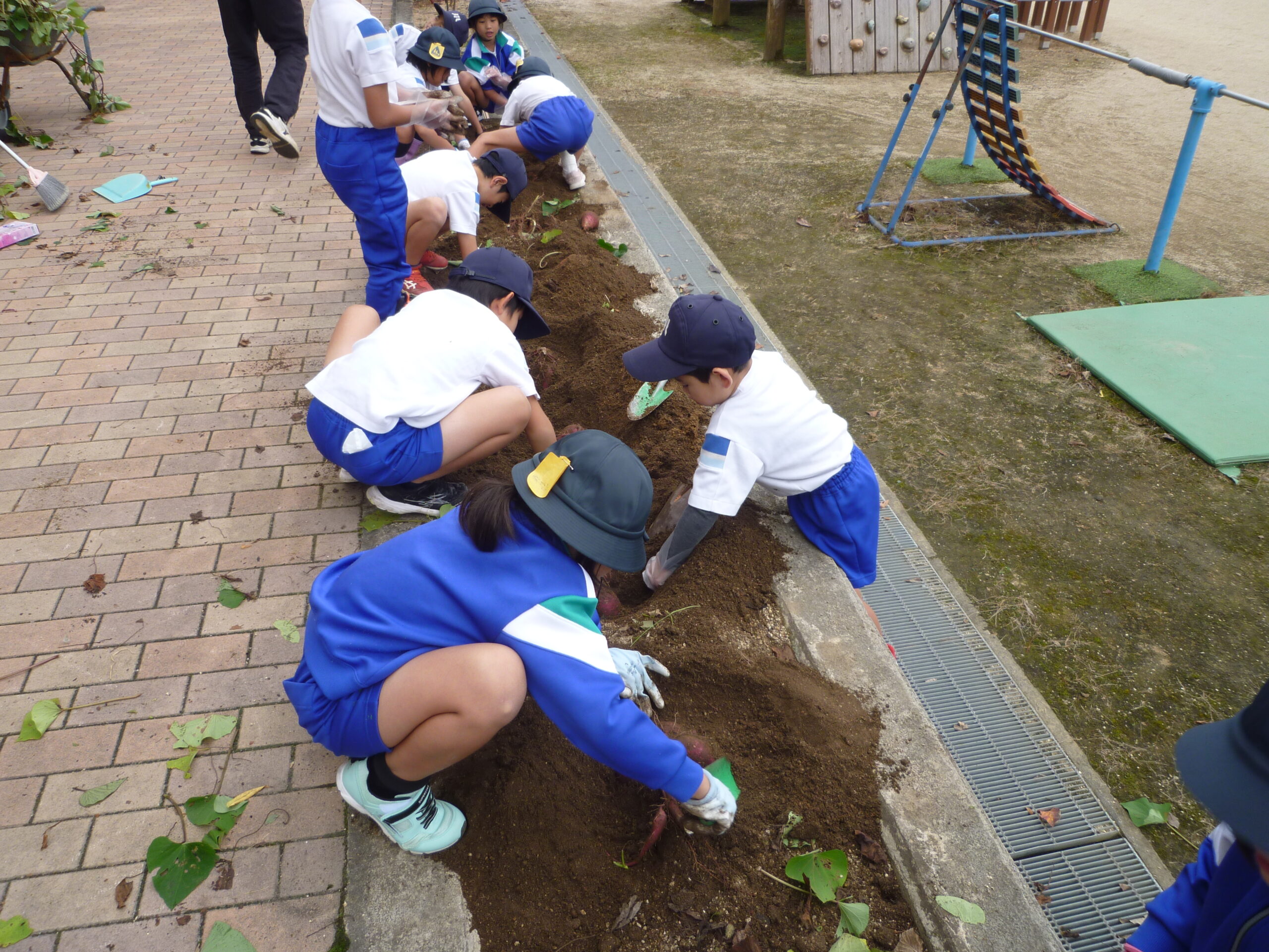 | 2年生が、自分たちで育てた校庭の畑のサツマイモ堀をしました。1年生の時には、近くの小椋さん宅の畑をお借りしてサツマイモを育てたのですが、校庭の畑でもりっぱな芋がとれました。予想していたよりも大きな芋を掘ることに、子どもたちは大興奮でした。掘った芋は、各自で家にもって帰りました。きっとおいしいサツマイモ料理になることでしょう。 |