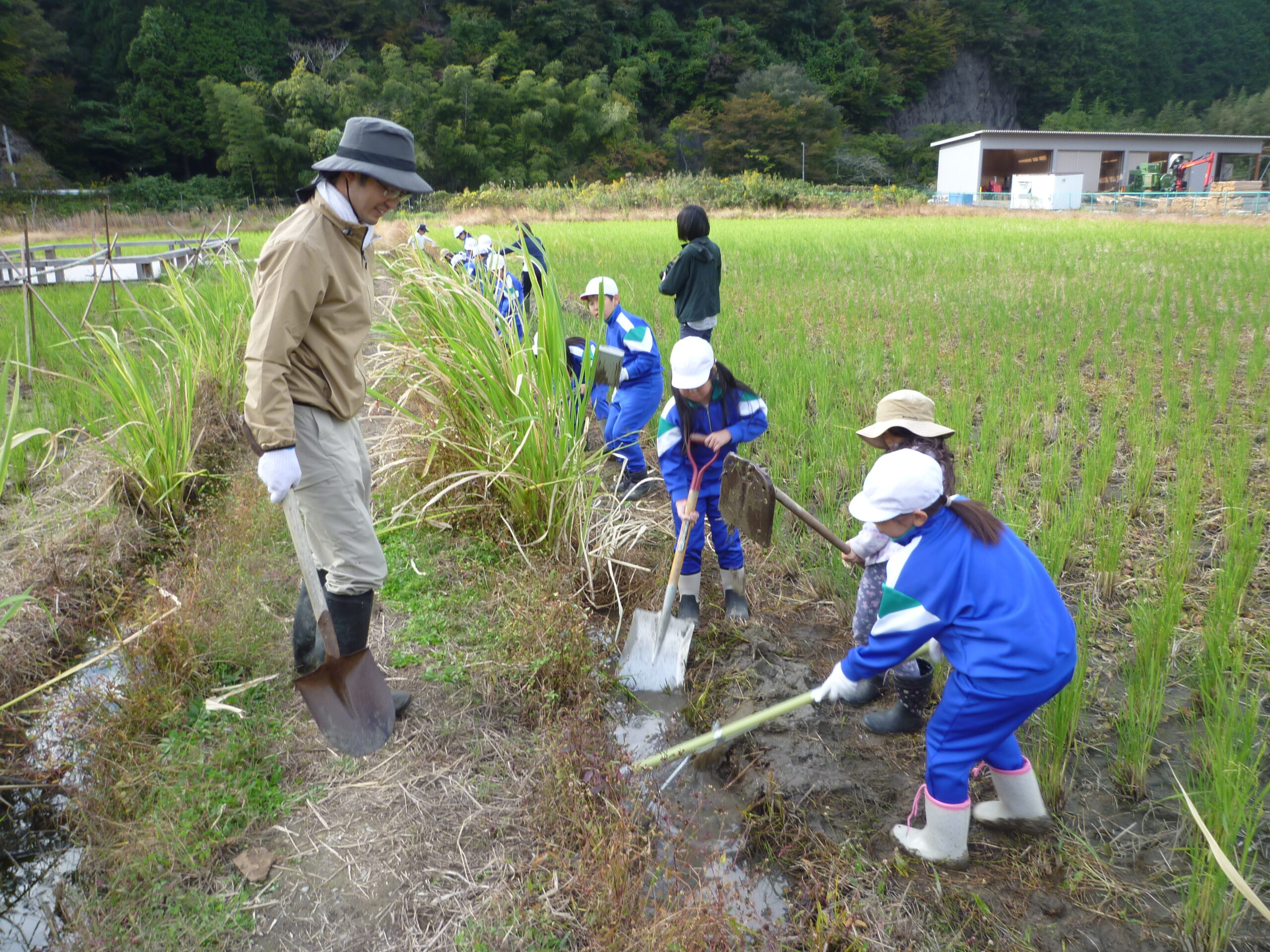 | 西粟倉には、絶滅危惧種に指定されているタガメが生息している田んぼがあります。3年生は、あわくらみらい学で、このタガメを守るために自分たちに何ができるのかを考えています。タガメにとって田んぼの溝は、とても大切な場所です。しかし、その溝に土が埋まっていると水かさが十分ではなくなり、タガメの餌となる小動物が生息しなくなります。そうなると、当然、タガメもいなくなります。そこで、タガメ博士の太刀川さんの指導の下、みんなで、田んぼの溝の泥上げをしました。慣れない大きな鍬やスコップを使って、一生懸命に泥上げをしました。子どもたちがタガメを思う心が伝わってきました。3年生の皆さん、ご苦労様でした。きっと、来年、タガメがいっぱい見られると思いますよ。 |