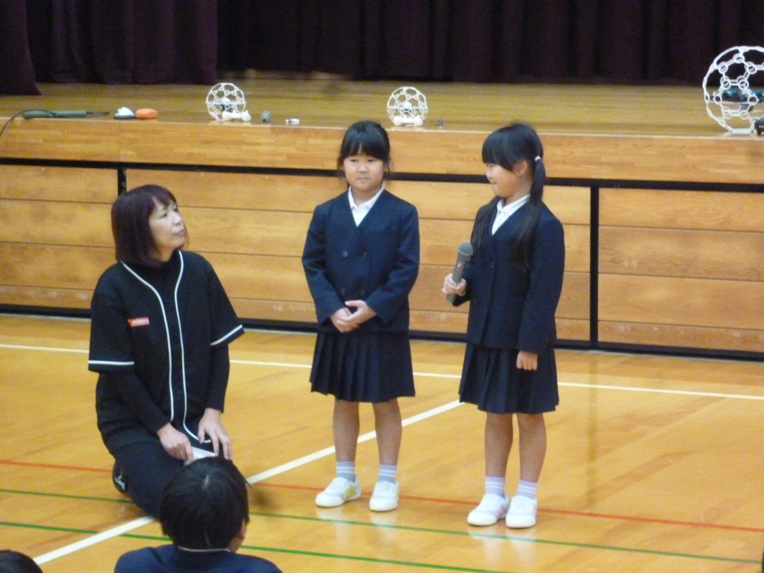 このドローンサッカーは韓国で生まれ、今や世界大会が開かれるまでに広がっています。なんと、その世界大会に、今年、本校3年生の篠原あんずさんと、篠原すみれさんが参加しました。2人も本日の試合に参加したのですが、その操作技術はすばらしかったです。世界大会に行ったときの思い出も少し話してもらいました。みんな興味津々で聞いていました。