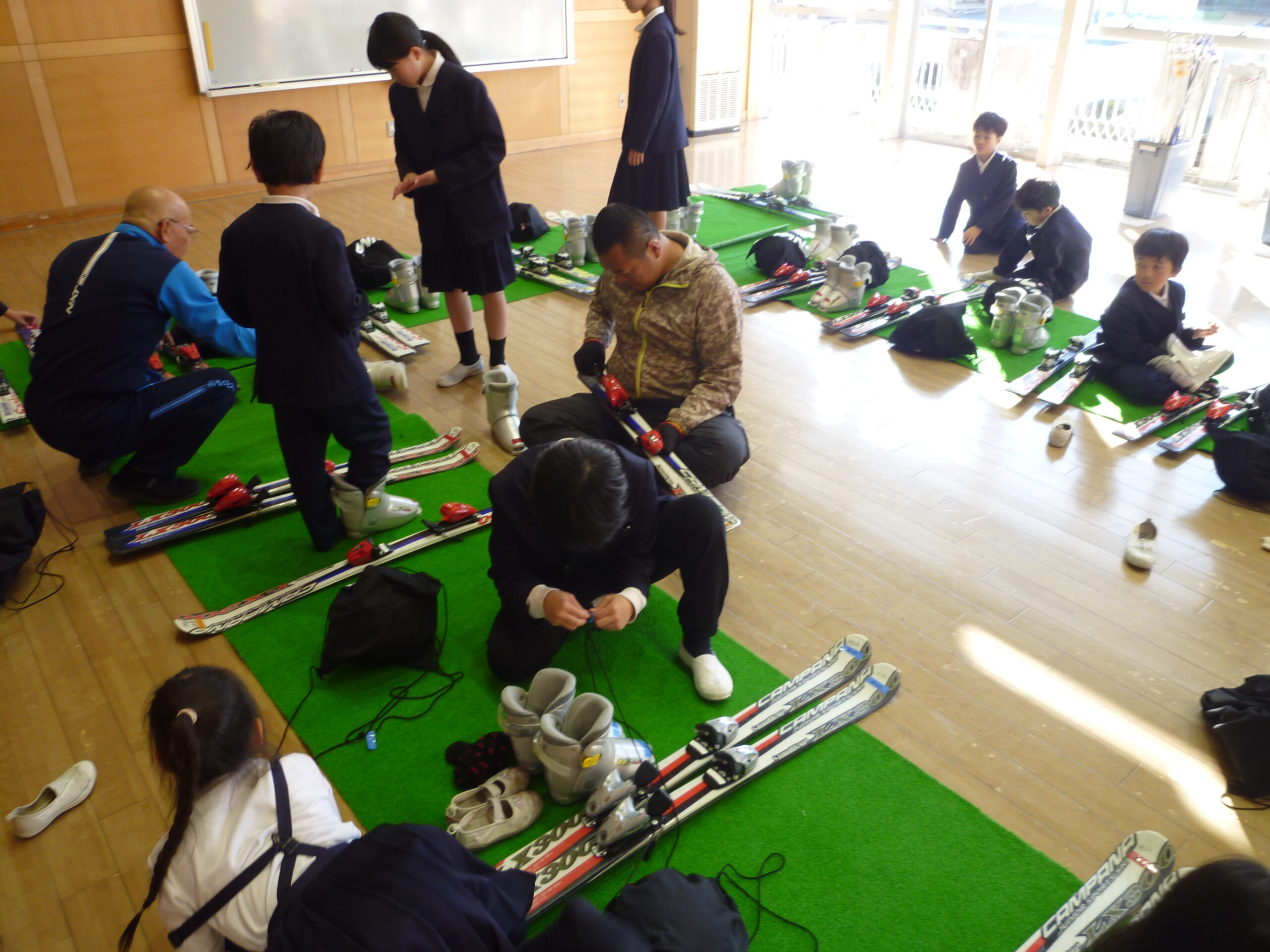 | 本日は、午前中、スキーのビンディング調整を個々に行いました。3学期のスキー教室に向けた準備が、もう始まったわけです。今から、ゲレンデに立つのが楽しみです。しかし、スキーには安全確保が求められます。ブーツと板がちゃんと合っていないと、事故のもとになります。そこで、毎年、このビンディング合わせをしているのです。ただし、ビンディング合わせをするには、スキーの知識をもった大人の力が必要です。今年は、岸本さん(保護者)と関さん(地域の方)にお越しいただき、この作業のお手伝いをお願いしました。お二人のおかげで、例年に比べ、スムーズに作業を終えることができました。大変お世話になり、ありがとうございました。子どもたちは、今から、スキーが待ち遠しいようでした。 |