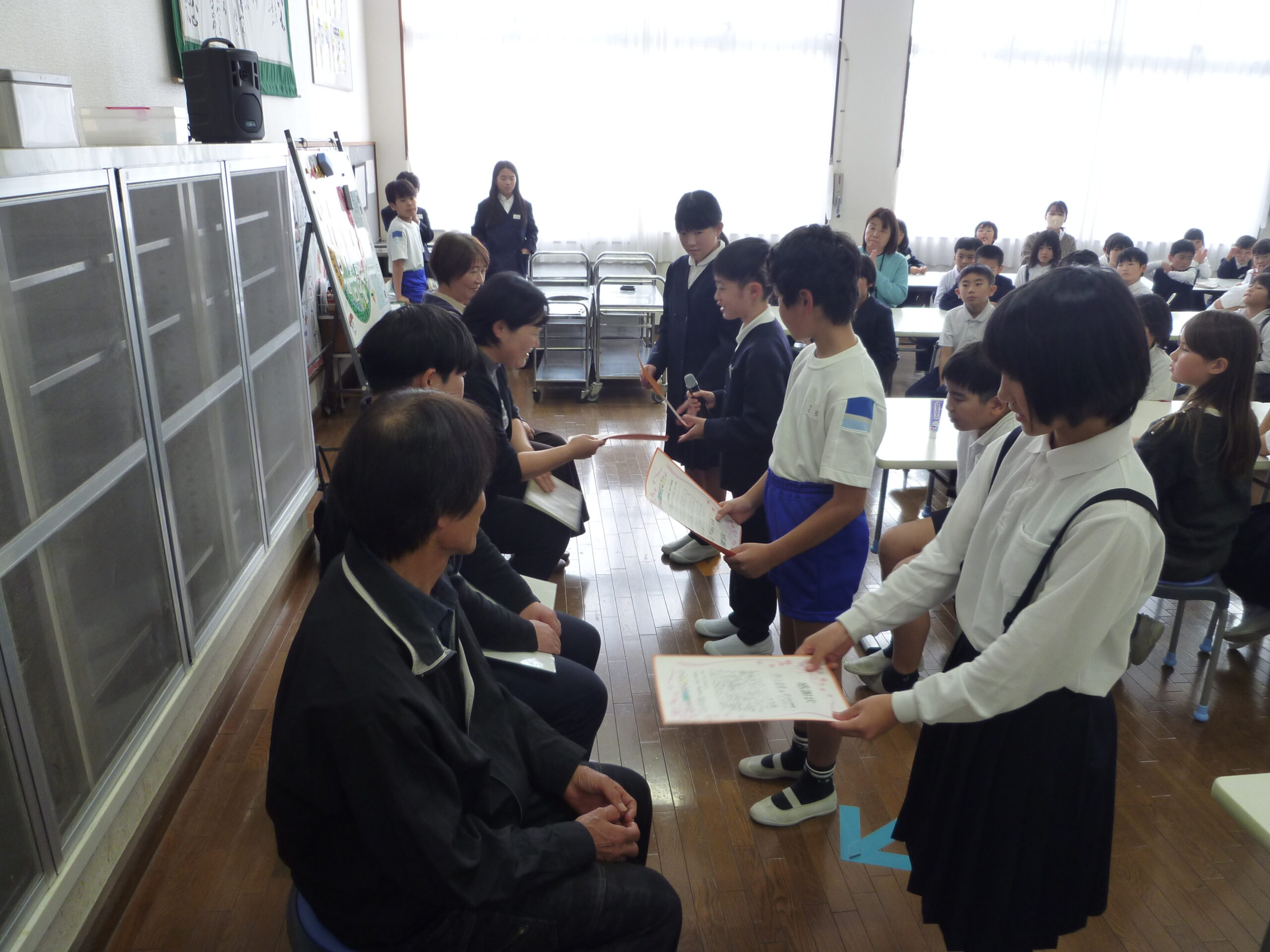 | 日頃、給食の食材を提供してくださっている方々をお招きして、「ふるさと元気感謝給食」会を開催しました。メダカ米の井上さん、ジビエの野木さん、米粉の関さん、野菜の河野さんがお越しになられました。子どもたちと一緒に給食を食べていただいた後、生産者の方へ質問をして答えていただきました。それぞれの方々から、子どもたちへの願いも語っていただきました。最後に、今回の企画の健康委員会から、4名の方に感謝状を贈りました。生産者の方の思いがつまった給食の味は、格別でした。給食がいろいろな方の協力で成り立っていることを理解することで、子どもたち自身の給食に対する考え方が変わったことでしょう。これも、「わがごと」の一つです。本日お見えでない生産者の方々もいらっしゃいます。こうした皆さんも含め、生産者の皆様、日々、本当にありがとうございます。 |