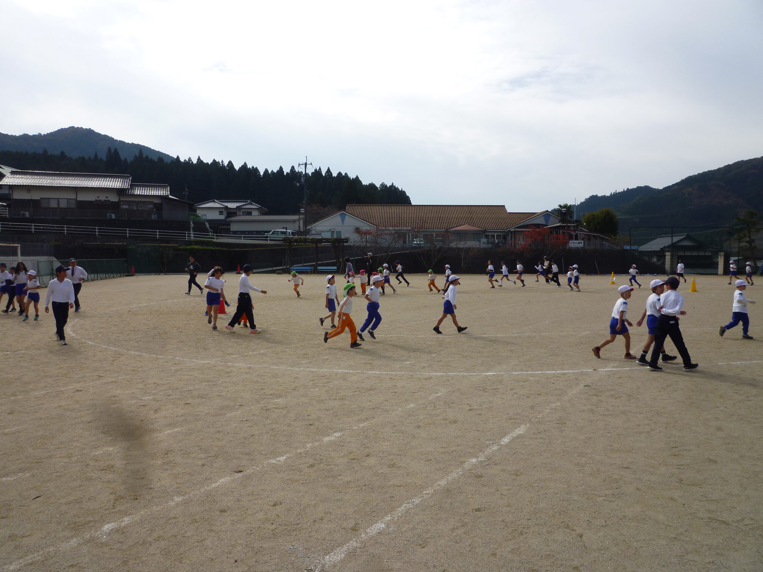今年も体力向上のために持久走週間を行っています。業間休みに、全校が集って運動場を走ります。低学年と高学年で走るコースが分かれています。音楽がなると、一斉に走りだす姿は爽快です。今年は幼稚園児も参加してくれています。中には、幼稚園児と手をつなぎながら走る高学年の姿も見られます。