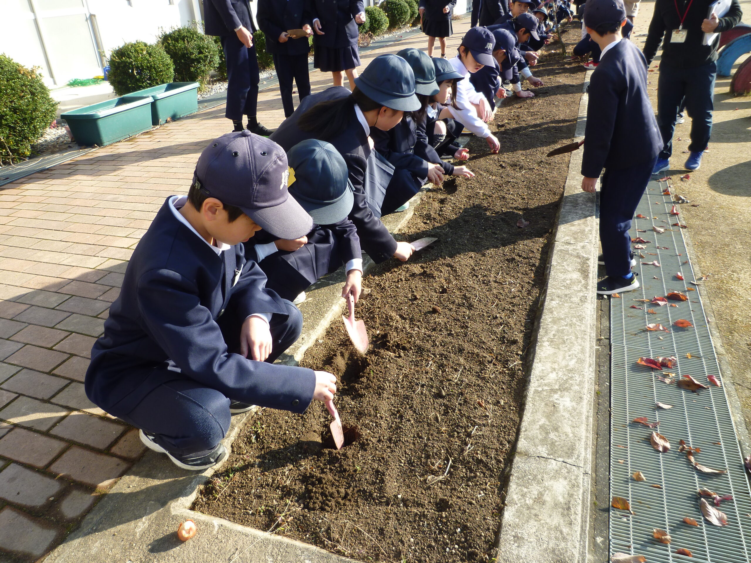 | 花植え集会がありました。美化委員会主催で、毎年、行っている集会です。来年入学してくる1年生を花いっぱの学校にして迎えてあげようという趣旨で、校庭の花壇にチューリップの球根をいっぱい植えました。 ここでも、高学年が低学年に植え方を説明したり、実際にやってみせたり、いっしょに手を添えて球根を植えたりする姿が見られました。こういった温かい気持ちがチューリップに込められ、来年の1年生にも伝わってくれるといいなあと思います。 |
