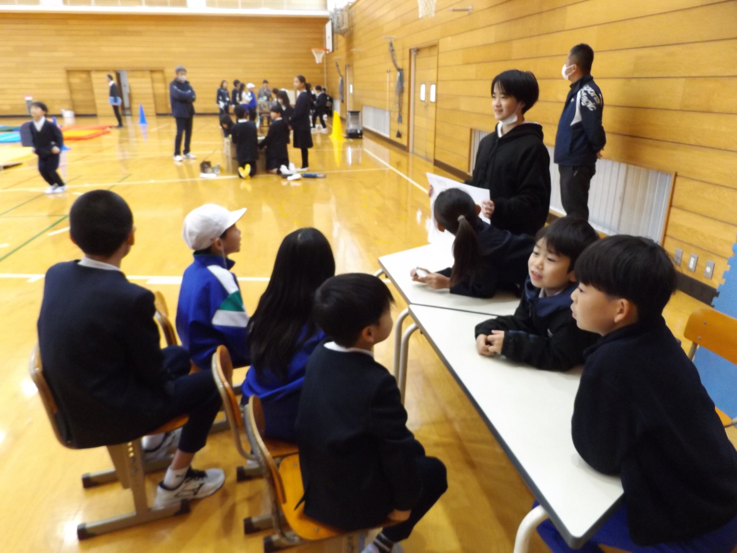 続いては、4つのグループに分かれて「なんでもバスケット」をしました。お題を6年生が事前に準備してくれていたので、スムーズに進めることができました。どこで行うかをグールで相談したり、フープを譲り合ったり、ゲーム中に困った子がいると、近くの子が気遣って助けたりといった微笑ましい姿が見られました。