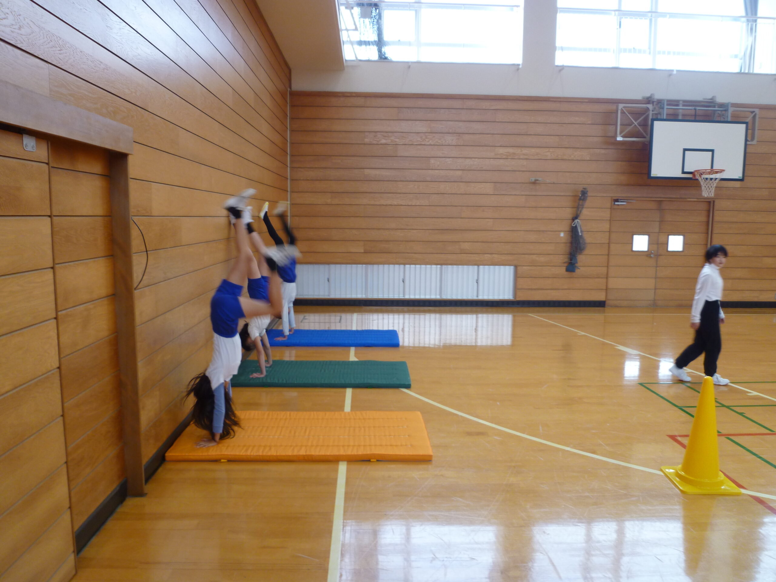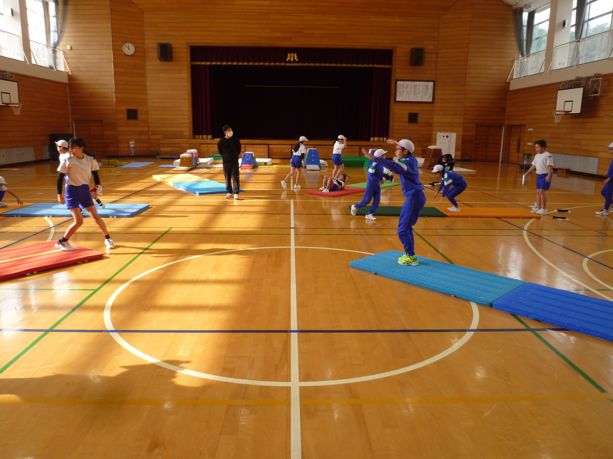 | 今日からマット・跳び箱週間が始まりました。業間時間に、児童が体育館に集まり、自分のめあてをもって、いろいろな技にチャレンジします。体力向上プロジェクトの一環です。器械運動は、ややもすると敬遠されがちなのですが、こういった場があることで、本校には器械運動が得意な児童が多いです。また、こういった体育面からも、粘り強く取り組む態度を身につていきたいと考えています。 |